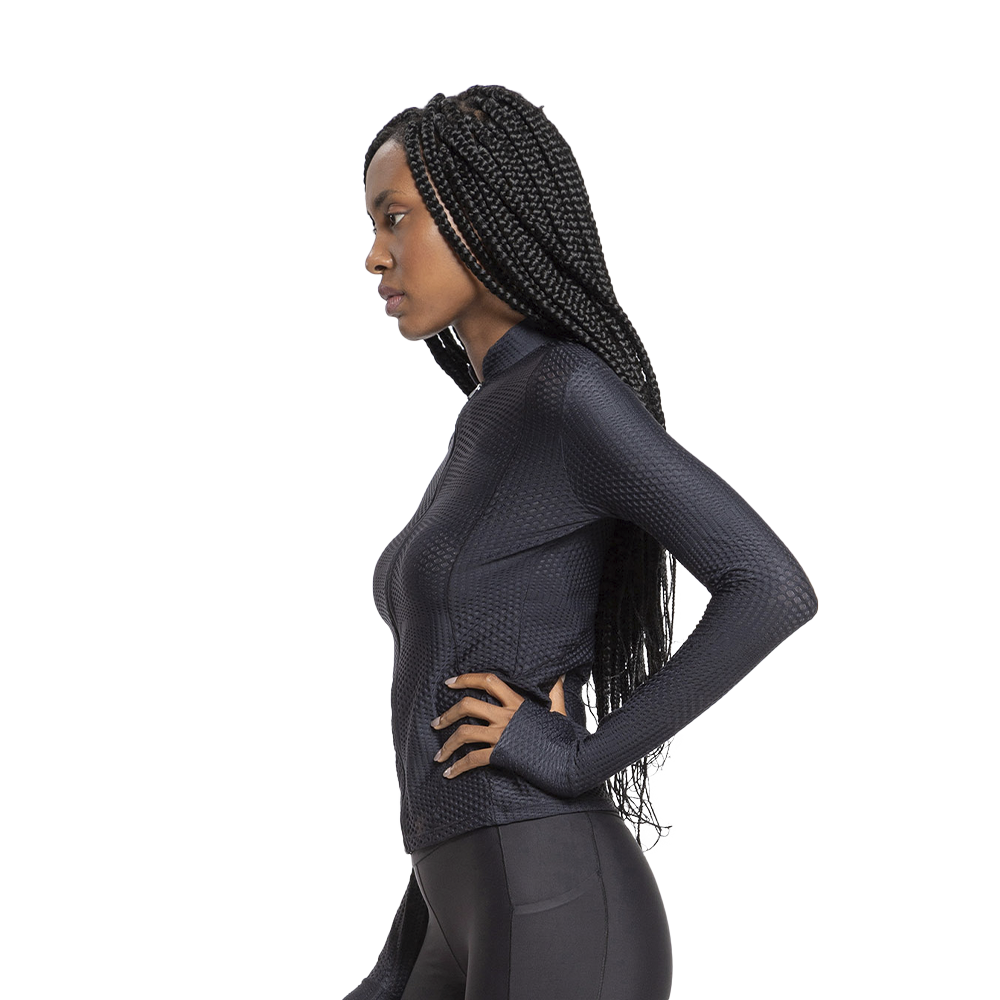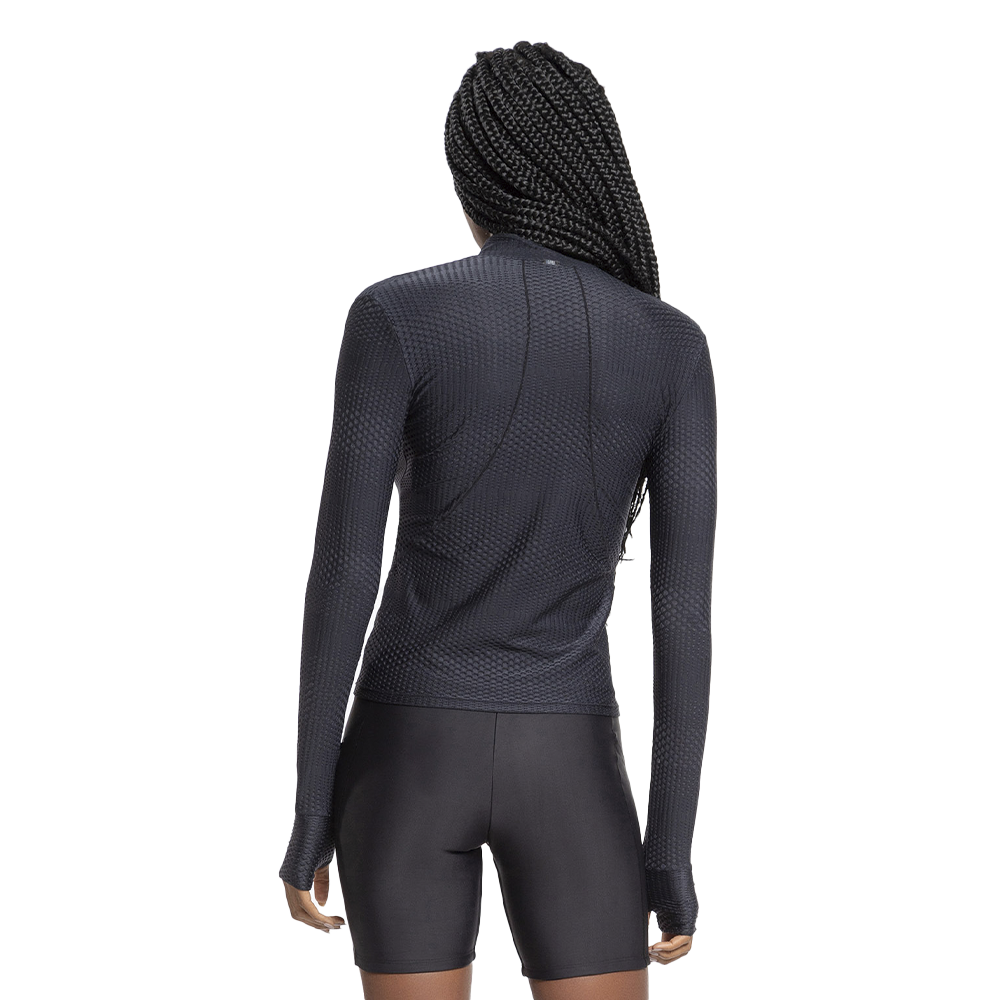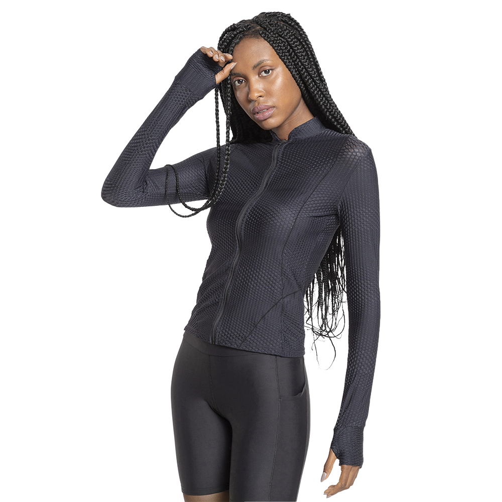 Chamarra Running para Mujer LIVE! Ligera, cuello alto y cierre personalizado. Cuenta con abertura para el pulgar en los puños lo cual aporta mayor comodidad y seguridad. Tejido 80% poliamida y 20% elastano con tacto suave y efecto de superficie texturizada. Chamarra con tecnologías Easy Care y Quick Dry.