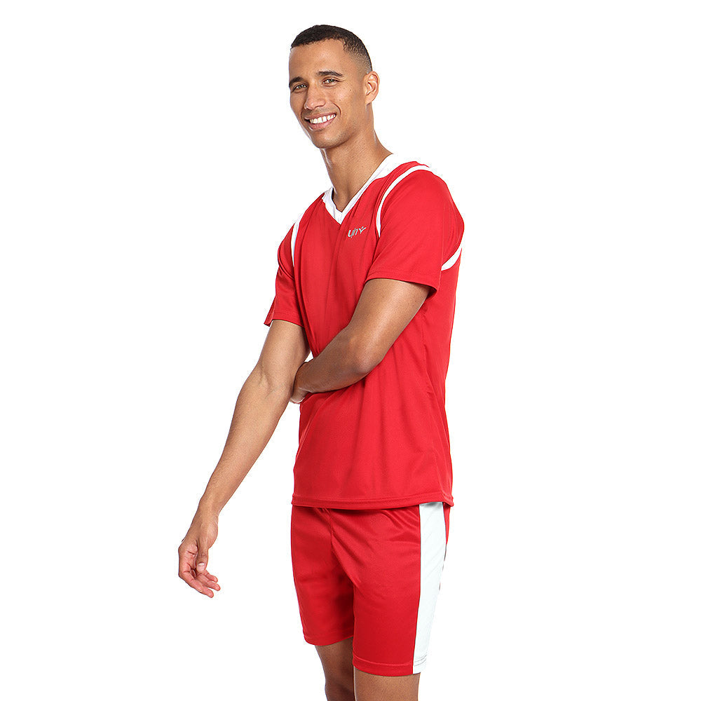 Kit (playera y short) básico para Caballero. Playera: cuello V, manga corta y logotipo reflejante. Short: cintura elástica ajustable y logotipo reflejante. 100% poliéster.