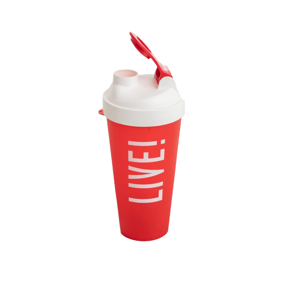 Shaker para Proteína LIVE! Incluye un resorte interno que ayuda a mezclar y disolver tus suplementos alimenticios. Tapón tipo rosca. Capacidad 600 ml. 100% Polipropileno.