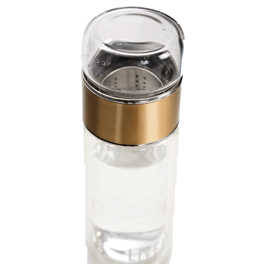 Prepara y disfruta de tus infusiones favoritas con este termo de vidrio LIVE!. Incluye un separador de infusiones el cual impide que se filtren hojas sueltas o ramitas mientras tomas tu bebida favorita. Fabricado en vidrio grueso el cual ayuda a mantener la temperatura por mucho más tiempo. Su tamaño es portátil y cuenta con tapa hermética antiderrames. Capacidad de 390 ml.